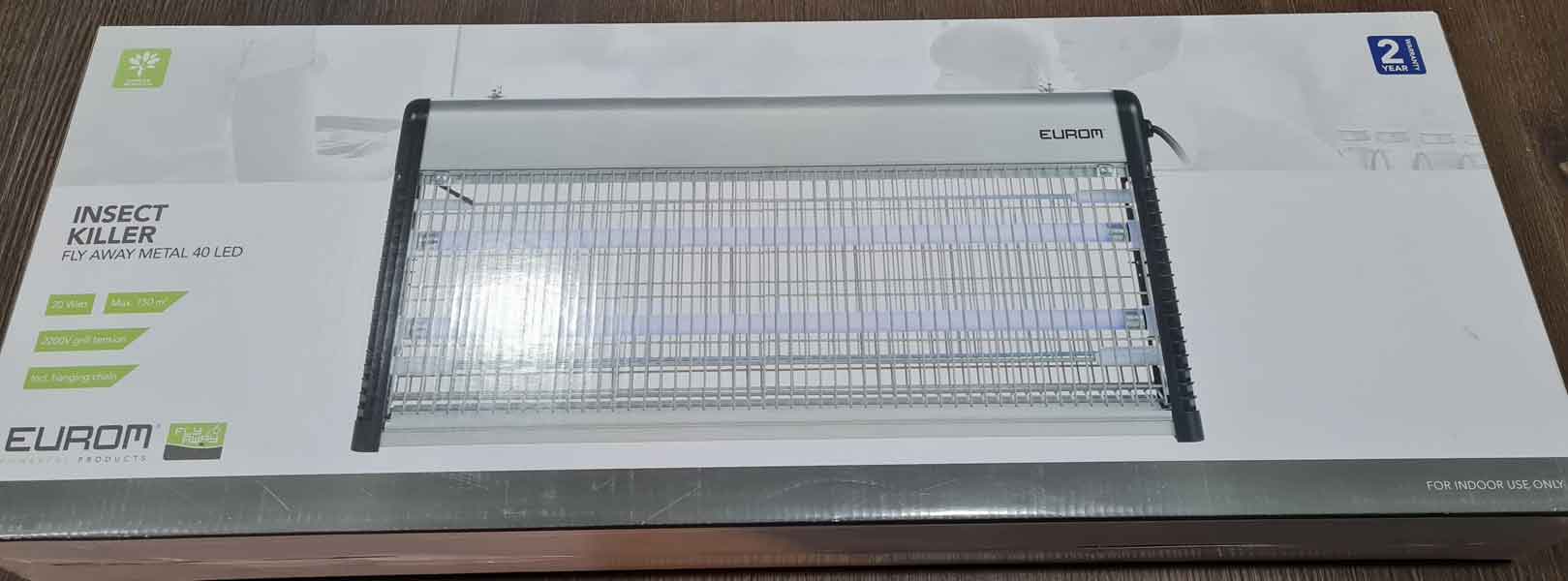 Der Eurom Fly Away Metall 40 LED ist ein leistungsstarker Insektenvernichter für den Innenbereich. Ideal zur effektiven Bekämpfung von Fliegen und anderen Insekten in Wohnräumen oder Büros. Die beiden integrierten LED-Lampen (2 x 10 Watt) ziehen Insekten zuverlässig an. Diese werden anschließend durch das Hochspannungsgitter (2200 Volt) schnell und effektiv beseitigt. Die Insekten werden in einer herausnehmbaren Auffangschale gesammelt, die eine einfache und hygienische Reinigung ermöglicht. Das robuste Aluminiumgehäuse sorgt für eine langlebige Nutzung. Dank der mitgelieferten Aufhängung kann das Gerät sowohl stehend als auch hängend verwendet werden.